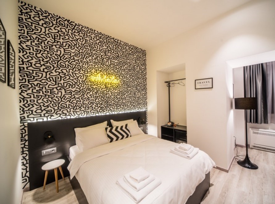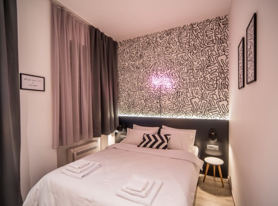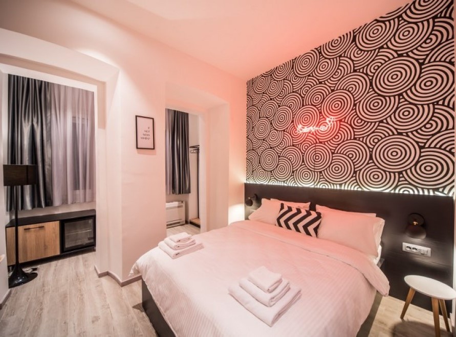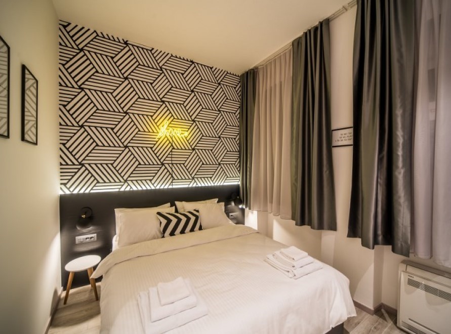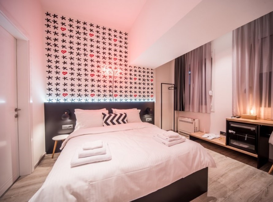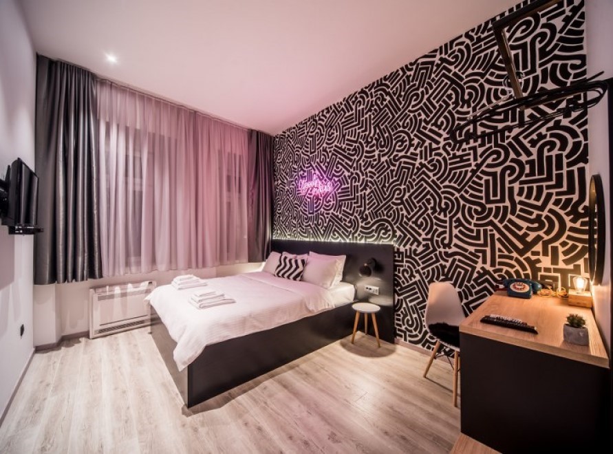 Ugodna dvokrevetna soba sa bračnim krevetom koja je dizajnirana kao prostor u kom su zabava i opuštanje u savršenom skladu, a svaki detalj u sobi govori o tome.