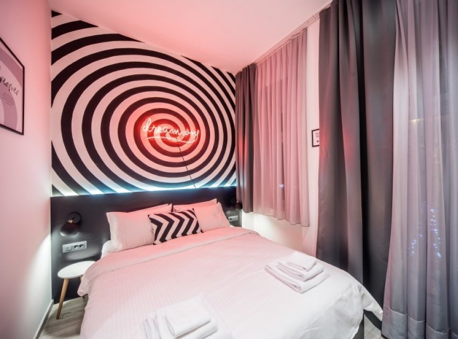 Opuštajuća dvokrevetna soba sa bračnim krevetom osmišljena kao mjesto koje će goste razveseliti i opustiti u isto vrijeme, a to postiže kombinacijom zabavnih elemenata i ugodnog ambijenta.